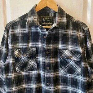 Jachs Mens Flannel Shirt Button Front Long Sleeves Plaid Black White Medium