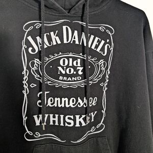 This black sweatshirt hoodie features the iconic Jack Daniels whiskey logo prominently displayed on the front. The logo is also on the hood + lettering on both sleeves.