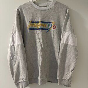 This Jack & Jones sweater features a classic crew neck design in a light heather gray color. The front showcases a vibrant graphic with a yellow bar and red text, adding a stylish touch to the casual look. Ideal for everyday wear, this sweater combines comfort with a modern aesthetic.