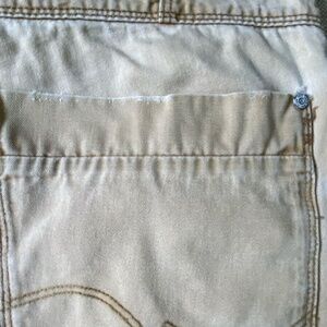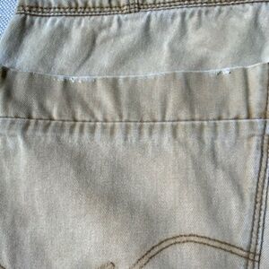 SOME WEAR- small hole above the back pocket on the pocket hem - some distressing on the top of the back pockets and wearing above the studs on the back pockets- still very durable and still lots of wear left