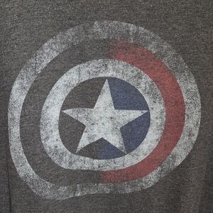 This gray short sleeve tee features a distressed Captain America shield design, offering a vintage and relaxed look. Made from a soft cotton blend, it ensures comfort and style for everyday wear. Length 28" Bust 42" Sleeves 8"