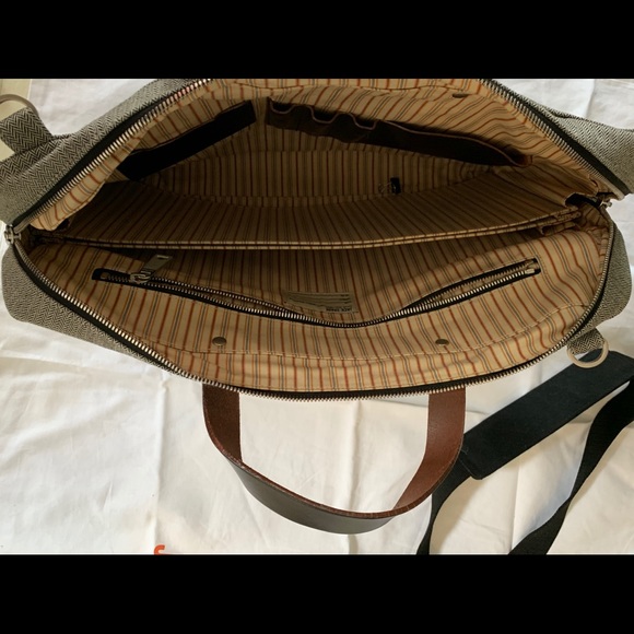 Jack Spade unisex briefcase in black and white herringbone print, with functional dividers on the interior and exterior zip pocket. Detachable strap and original duster bag.