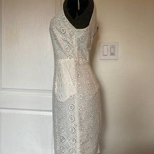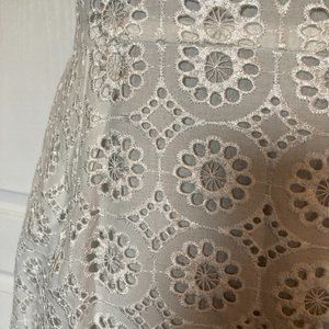 This beautiful white shift dress is fully lined and hits at the lower thing for a long mini-dress. Jack by Dakota has brought us the perfect dress for a wedding shower, bachelorette party, or even a casual garden wedding, with it's embossed floral-esque pattern and tidy back zip closure, and yes - it has pockets!