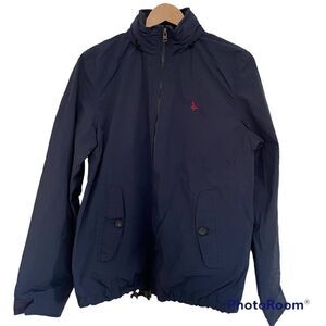 Jack Wills, navy blue bomber style windbreaker. Zip up with double zipper, fully lined with breathable mesh. Snap closure on cuffs, draw strings on inside to adjust the hem, two slanted front pockets with button closure. Hidden hood in collar.
