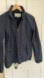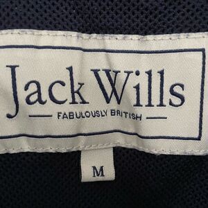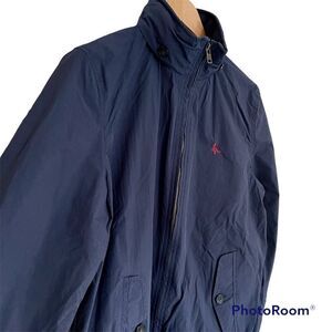 Jack Wills, navy blue bomber style windbreaker. Zip up with double zipper, fully lined with breathable mesh. Snap closure on cuffs, draw strings on inside to adjust the hem, two slanted front pockets with button closure. Hidden hood in collar.