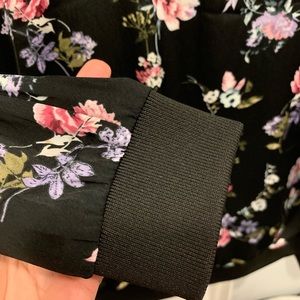 Black with floral print. New, worn maybe once or twice at most. Light material, feels like satin