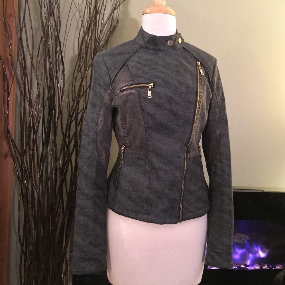 Nice little jacket with a mix of denim imitation vinyl in charcoal and blue colors. Never worn.