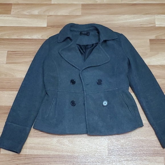 Peacoat type jacket. Good condition. Smoke free home. Home with pets. Small rip inside right front pocket. Great spring/fall jacket.