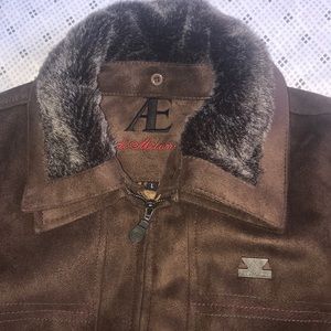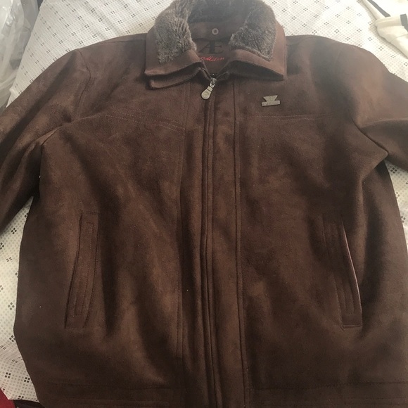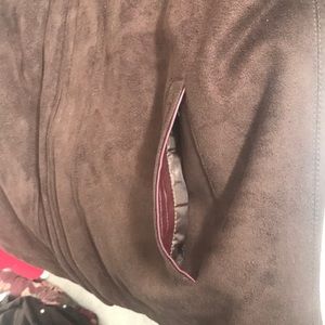 Suede jacket, detachable fur on collar. 10/10, never worn. Can fit a medium.