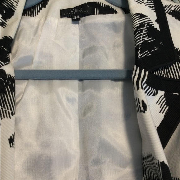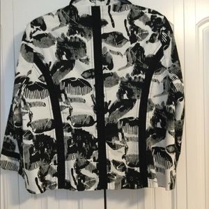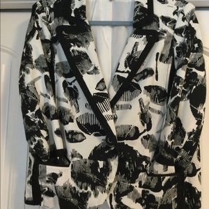 Black and white ladies jacket. Fully lined. One button closure, two front packets, slightly tailored.