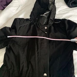 Warm jacket with fur in the hood and an adjustable waist