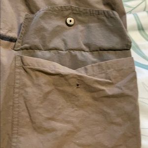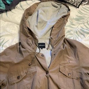 Super comfy green/brown jacket. Missing part of a snap and has small hole in front. It looks cute with clothes pins as shown in this picture. Well used. Good condition.