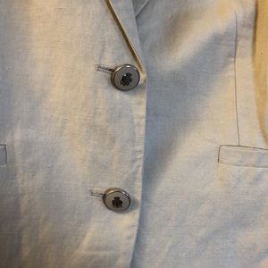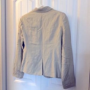 Premise Jacket.Sandstone neutral colour.It’s a 55 % Linen and 45% Rayon, with 100 % polyester liner.It’s a beautiful jacket that will go with most anything.Try it with a pretty soft floral or plain coloured Summer sleeveless dresses, dress pants or leggings with a nice shoe or sandal.It is a perfect choice to go with most anything.