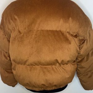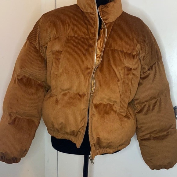 Burnt brown puffy cute jacket does not stretch has two high pockets.