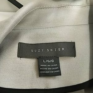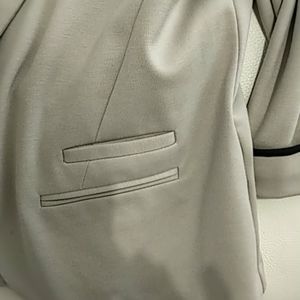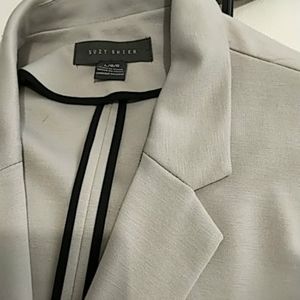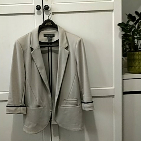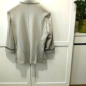 Suzy Shier unlined taupe jacket with dark brown piping on the cuffs. 3/4 length sleeves; pit to pit 18"; shoulder to shoulder 15"; jacket length 24"