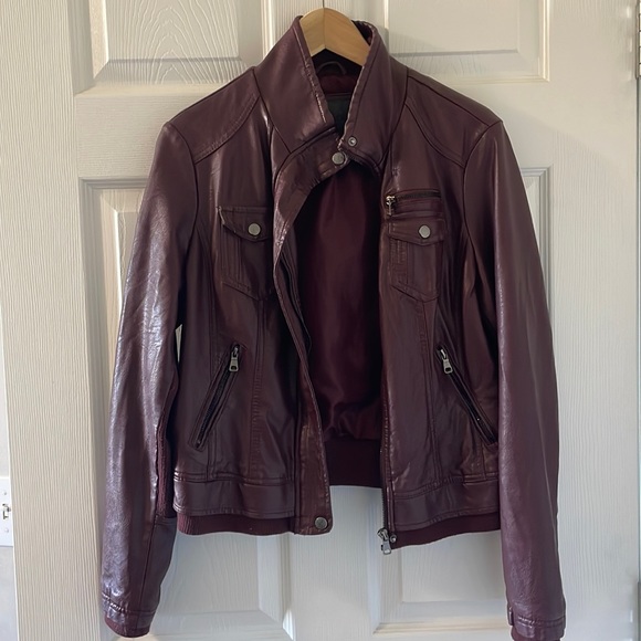 Burgundy leather style jacket with fabric elbows and 3 zippered pockets