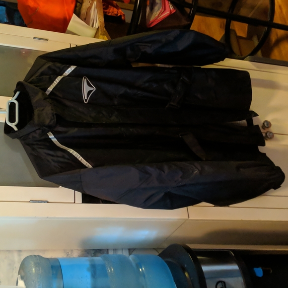 Nice black jackets with adjustable waist. Gray reflection in dark. windbreaker. very good condition. I believe the size to be a large.