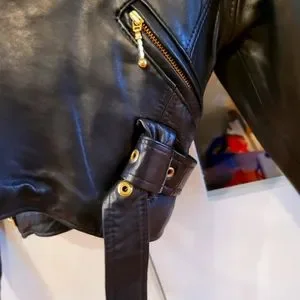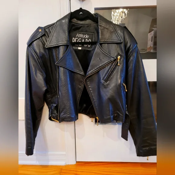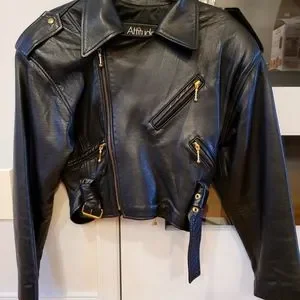 Beautiful leather jacket. it is a size small but fits more a Large in reality. Leather is in good shape. For a rock n' roll look! Nice open or close.