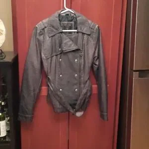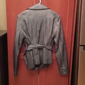 Soft leather grey/blue jacket. Zipper on side with pockets. Never worn. Smoke free.