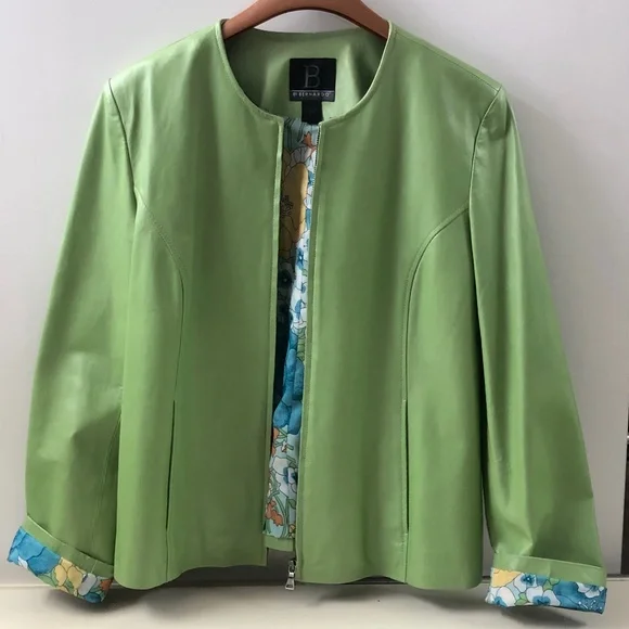 Élégant genuine leather with polyester flower design lining. Color: avocado green. Zipper. No pockets. Excellent condition. Pre owned but rarely used. Can be worn with sleeves folded over to show lining design. Full length: 23.5 inches. Shoulder to sleeve: 24.5 inches. Underarm to underarm seam : 21