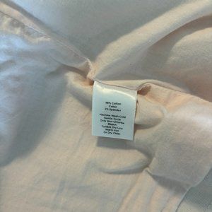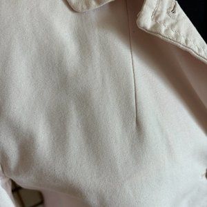 Blush pink denim jean jacket. Jacket is lined with a button front, cuffable sleeves, 2 front pockets, and back strap belt. Jacket has unique vintage look buttons. Size 16, measurements: underarm to underarm 22 inches, sleeve length 19 3/4 inches, back width 17 inches, back length 24 inches