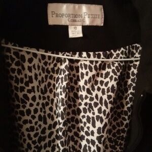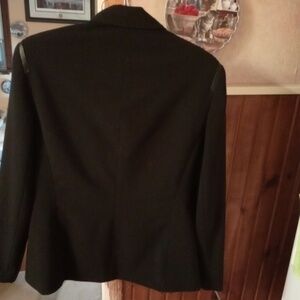 black jacket, size 10, Proportion Petite Conrad C, Made in Canada, Stretch, 60% polyester, 35% rayon, 5% spandex, good condition, no tears.