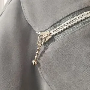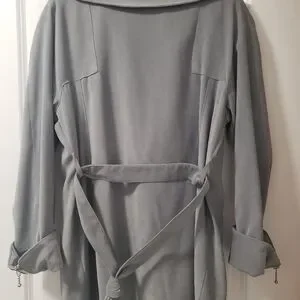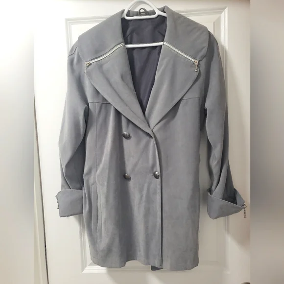 Light grey , spring jacket with belt , size L but it fits more like a medium , very soft velvety , suede like material , two side pockets , decorative zippers on the sleeves and collar , fully lined . Used only twice.