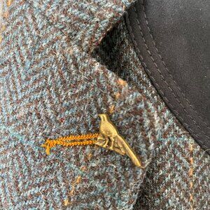 Suede detail on shoulder and pockets. Two button with inset pheasant graphic and a pheasant pin on the left lapel.