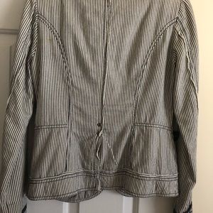 Very cool looking, this jacket was my favourite until it became too small for me. It’s 100% cotton, and it’s soft and comfortable. Little stripes navy blue and white, with coloured buttons in the front and on sleeves. A bit if wear in a back shoulder as seen on picture. Overall good condition. Size small- see pics for measurements. Still sad to let it go- but maybe someone else can love it now!