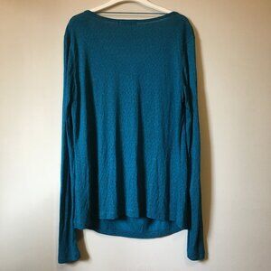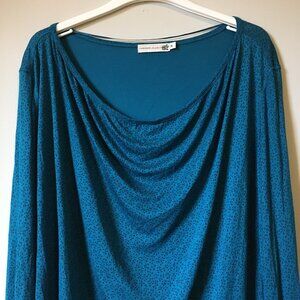Very good preowned vintage condition, peacock blue-coloured, long sleeved, cowl collar shirt in a jersey-like viscose fabric printed over in a black ditsy floral pattern. Love this brand. Bohemian for every season.