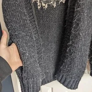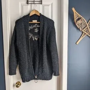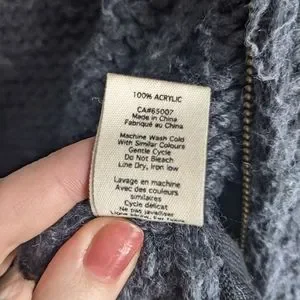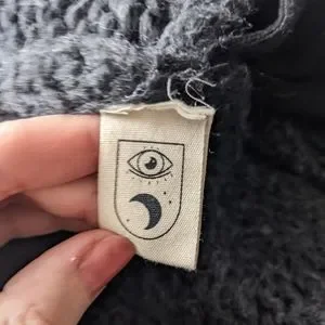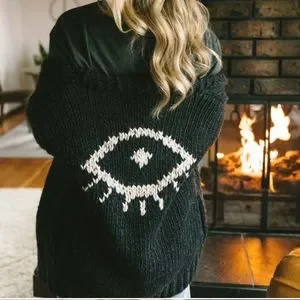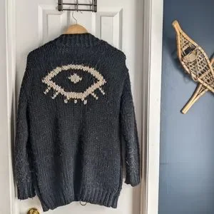 From the website: The chunky, soft knit is perfect for those fall evenings spent under the stars when the temperature drops but you're just not ready to go indoors yet. This cardigan features a zip front, functional side pockets and our signature eye detail which signifies connection and protection. The knit is 100% acrylic, making it soft and cozy and appropriate for even the most sensitive skin.