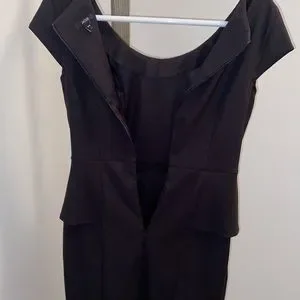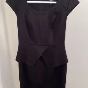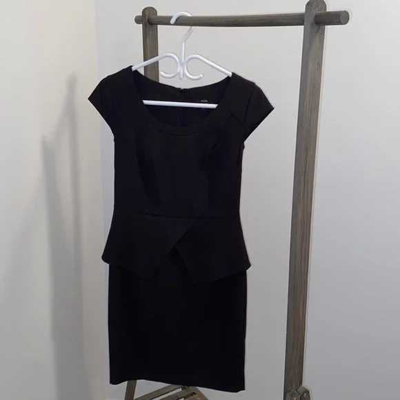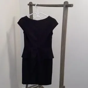 Women solid mini black dress. Falls approximately 2-3” above the knee. Short sleeve, zipper on backside with eye hook closure (zipper measures 22”). Empire waistline, extra fabric across waistline, split located at backside that measures 6”. Good amount of stretch, gently used, in good condition. Pit to pit measures 17”, length measures 37”.