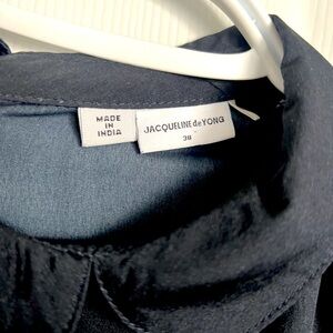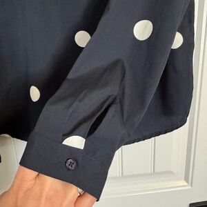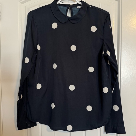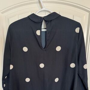Gorgeous navy & white poka-dot blouse with back button. Collar detail on the neck.