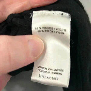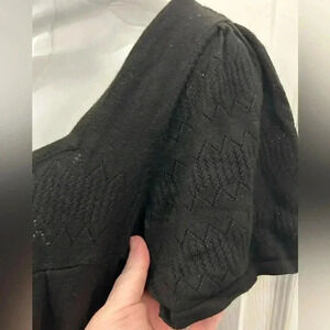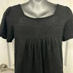 Loose and flowy black, knit shirt with embroidered top and sleeves. Excellent used condition. Viscose and nylon blend fabric is soft and light, even though it is knit. Very cute work to night top.