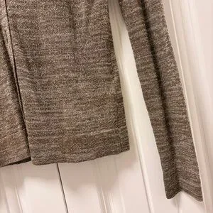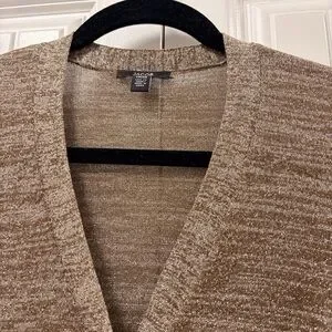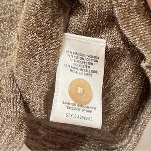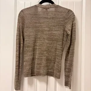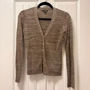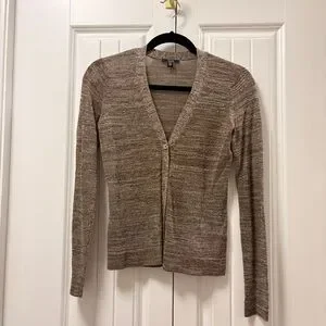 Elegant and lightweight shimmery cardigan in a gold taupe metallic blend. Features a deep V-neckline, single-button closure, and a soft, stretchy knit texture. Perfect for layering over camisoles or dresses for a subtle, sophisticated sparkle.
