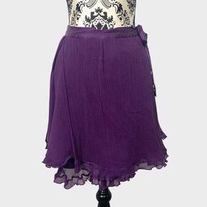 Romantic and feminine deep purple wrap skirt by Jacob in 100% silk. Features a crinkled texture, flowy silhouette, and double ruffle hem with a delicate self-tie waist. A timeless piece perfect for dressing up or down.