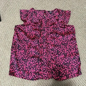 Like new condition. Flutter sleeve. Rounded collar. Ruffled front pleats. Keyhole back opening with button.
