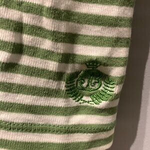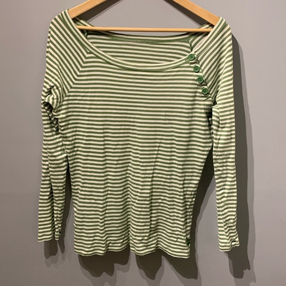 Green and white striped boatneck long sleeve t-shirt. No size tag, measures as a medium. PTP is 21".