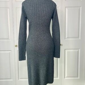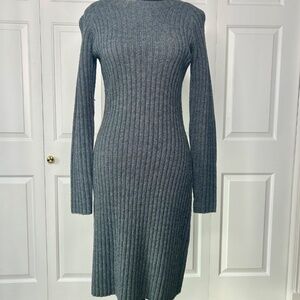 This is a beautiful grey sweater dress, with a slight cable knit pattern, in size Small. This dress is very versatile and it will become a core piece in your wardrobe. It can be glammed up for a more formal or fancy occasion, or dressed down for a more casual event or work. The dress drapes over the body, hugging your curves. It creates a beautiful silhouette. The dress hits around the knees. It’s in excellent condition.