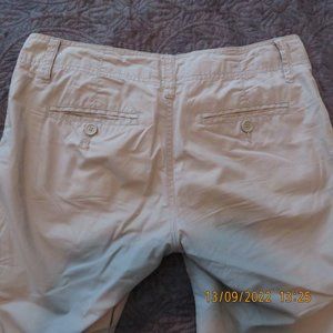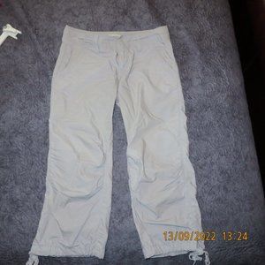 Very comfortable and lightweight, these capris are perfect for a casual outfit. They are low-rise, have sizeable side and back pockets, ruched knees for extra mobility, and ties on the bottom of each leg. They are a size XS, 100% cotton, and have no stains, rips or other issues. Feel free to message me with questions!