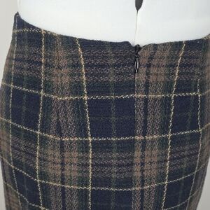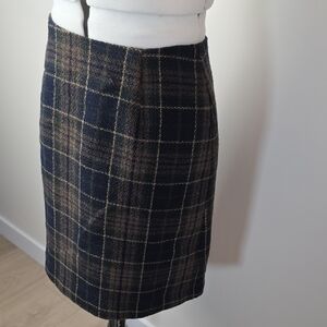 Jacob, plaid skirt, checkered skirt, wool skirt, winter skirt, fall skirt, made in Canada, classic skirt, office skirt, pencil skirt, straight skirt, vintage Jacob, timeless skirt, minimalist wardrobe, Canadian brand, dark plaid skirt, brown navy skirt, lined skirt, 90s style skirt, y2k skirt, small size skirt