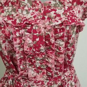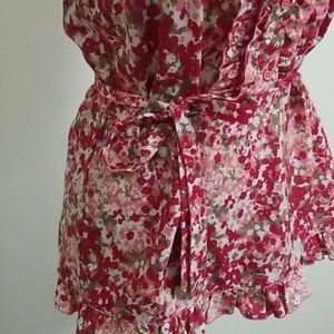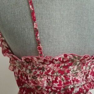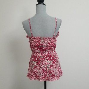This cute floral tank is the perfect summer staple! Ruffled top and hem give a sweet flirty vibe. Button front, and removable tie waist complete the look.