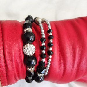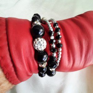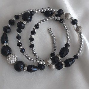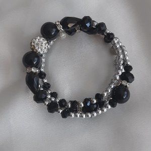 This pretty bracelet fit nicely on any size wrist. Has black beads of assorted sizes, smaller silver beads and one large bead with rinestones. Total length when stretch out is 23 inches. Never worn. Was given as gift but I have so many bracelets I never get a chance to wear it. I though someone else might like it. Make me an offer