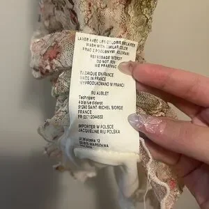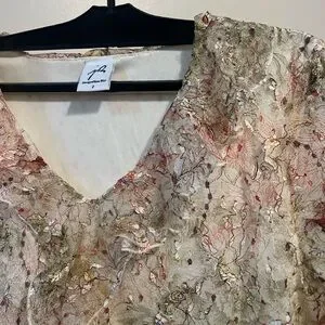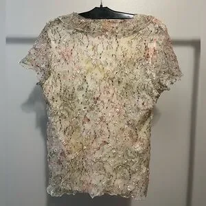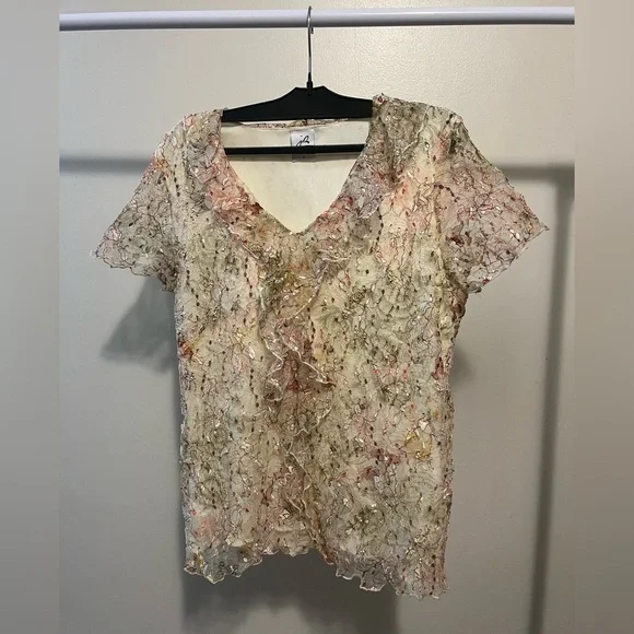 Jacqueline Riu multicolor textured blouse. inside is a white tank top, topped with see through textured flowery design and ruffle details.