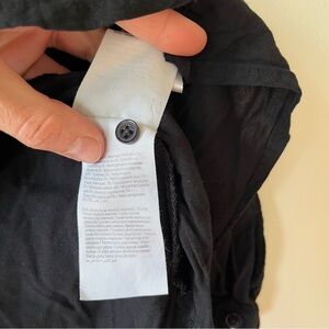 Lightweight black tunic shirt from Jacqueline de Yong. Features a button-front popover design, 3/4 roll-tab sleeves, and a flattering drop waist with rounded high-low hem. Made from a breathable cotton blend with a touch of viscose for softness. European size 34 (fits like XS-S). Wear as a tunic, or beach cover-up. Extra button included. Measurements in photos.