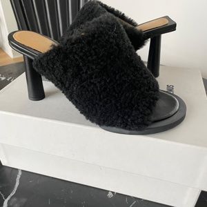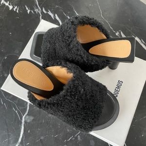 Jacquemus les mules carré round in faux black shearling, size 39, 80mm heel. Never been worn. Shoe box is damaged however shoes are in perfect condition.