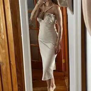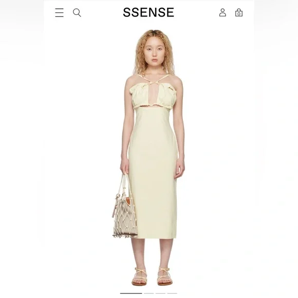 sleek midi silhouette with a gathered cutout bodice. Thin straps cross at the neckline for subtle detail. Minimalist design with clean lines. Soft pale beige