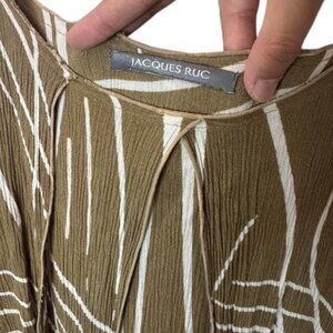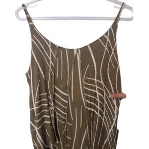 A Jacques Ruc layered maxi dress. Features a layered design, as described for similar styles from the brand. The dress in the image is a brown maxi dress with a white abstract or leaf-like pattern. It has spaghetti straps and a comfortable, flowing style suitable for warmer weather.