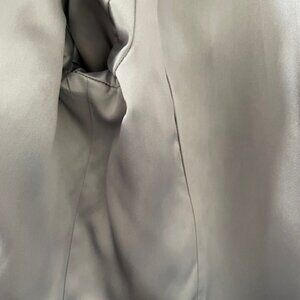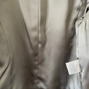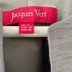 Jacques Vert – VTG Jacket - metallic gray - beautifully tailed - cropped – ¾ in sleeves with slit ( can be full length on a petite frame) – fully lined , polyester/viscose blend - clip closures so that front looks smooth when closed - size 10 – measurements from under the arms – 12.5 in sleeves, 14 in side length , 18 in across chest , 23.5 in back length (from neck to bottom of jacket )-smoke/pet free home
