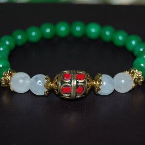 Jade Bracelet,Bronze Coral Charm,Jade and Red Bracelet